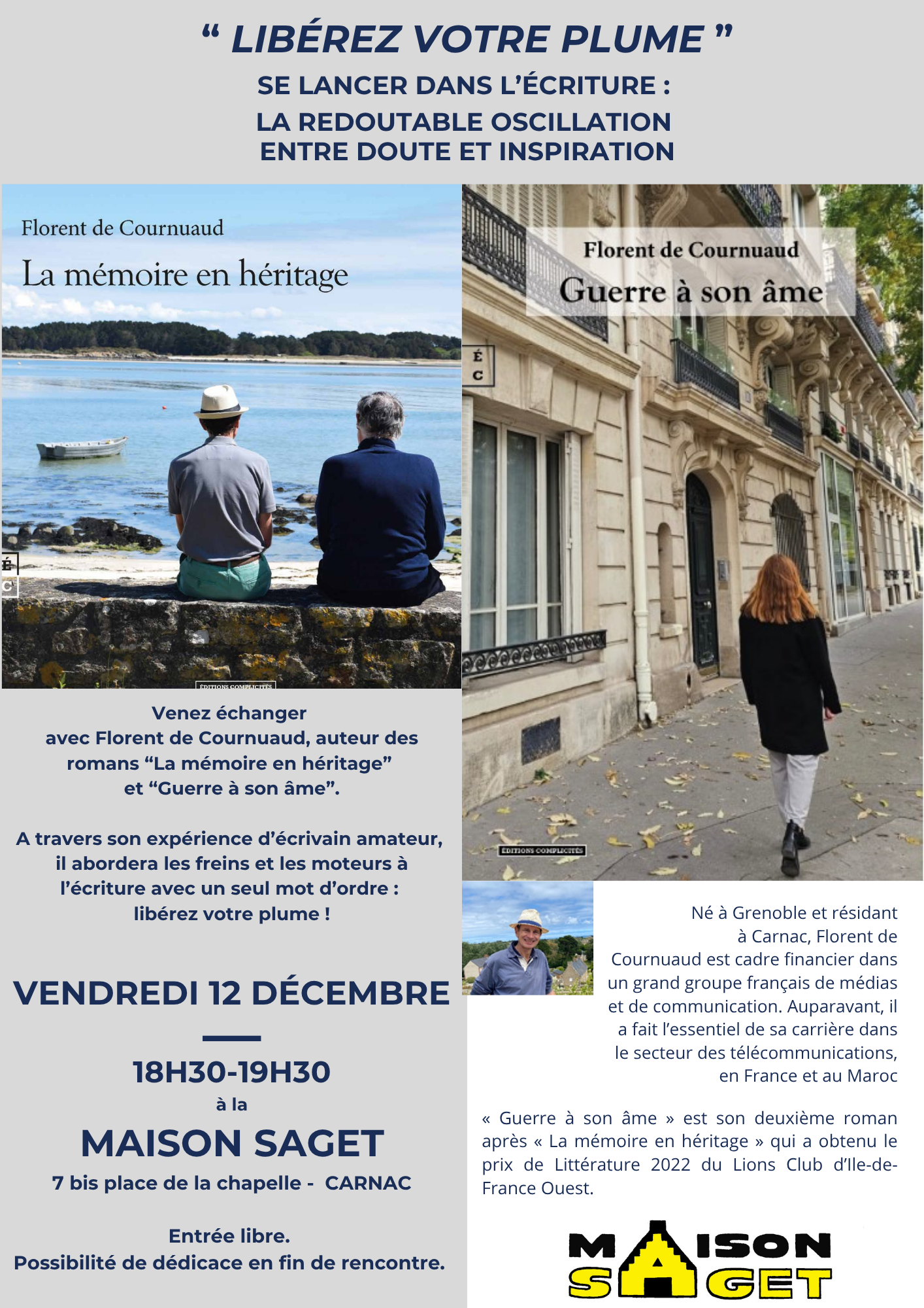 À 18h30 "Libérez votre plume", se lancer dans l'écriture : la redoutable oscillation entre doute et inspiration. Venez échanger avec Florent Cournuaud écrivain amateur, il abordera les freins et les moteurs à l'écriture avec un seul mot d'ordre : libérez votre plume ! Entrée libre. Possibilité de dédicace en fin de rencontre.