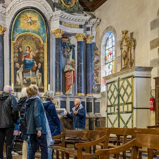 Vous découvrirez la richesse de son mobilier, l'ampleur et l'intérêt de ses peintures sur 750 m2, ainsi que de nombreux autres détails, en circulant dans l'édifice reconstruit et décoré selon les directives du Concile de Trente ( 16ème) .