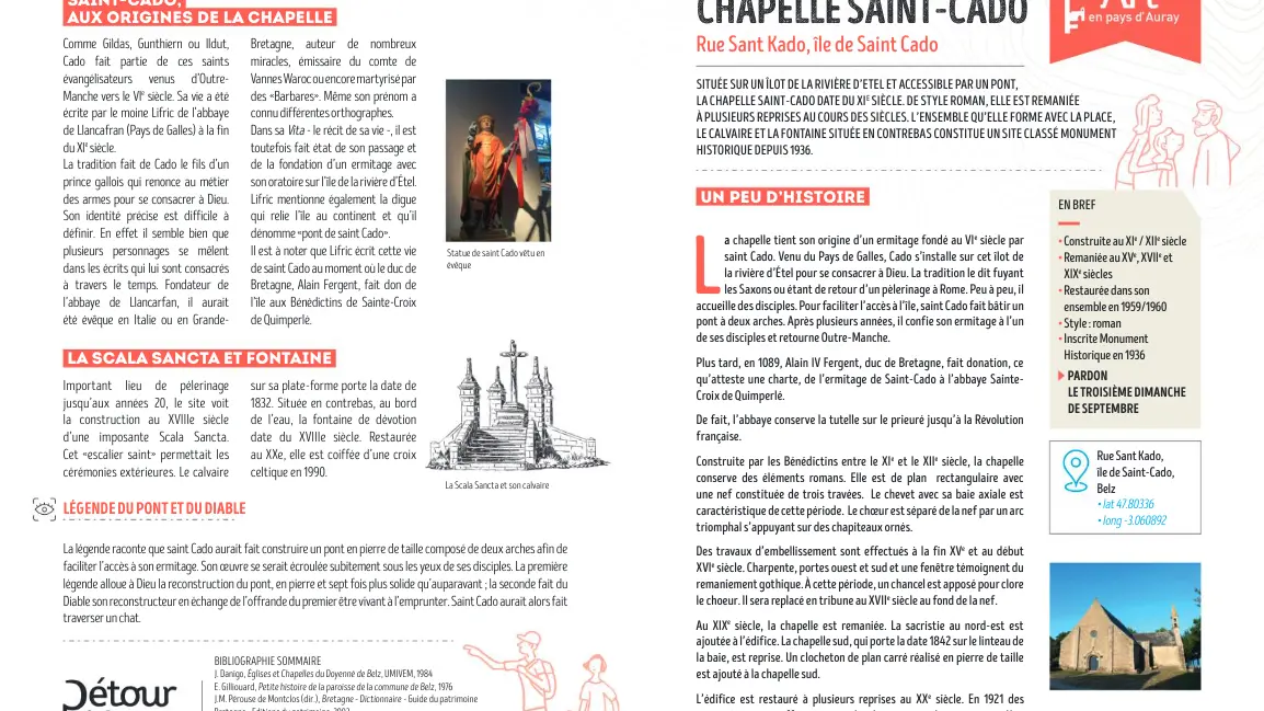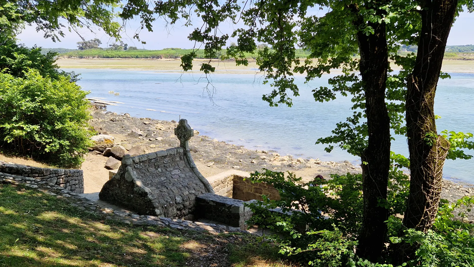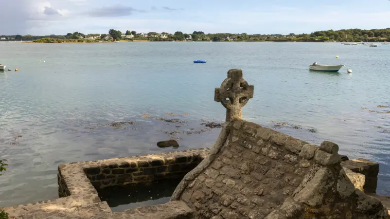 La légende raconte que saint Cado, fils d’un prince de Glamorgan en Pays de Galles, aurait choisi l’île au cœur de la rivière d’Étel pour y fonder son ermitage et y bâtir un oratoire.