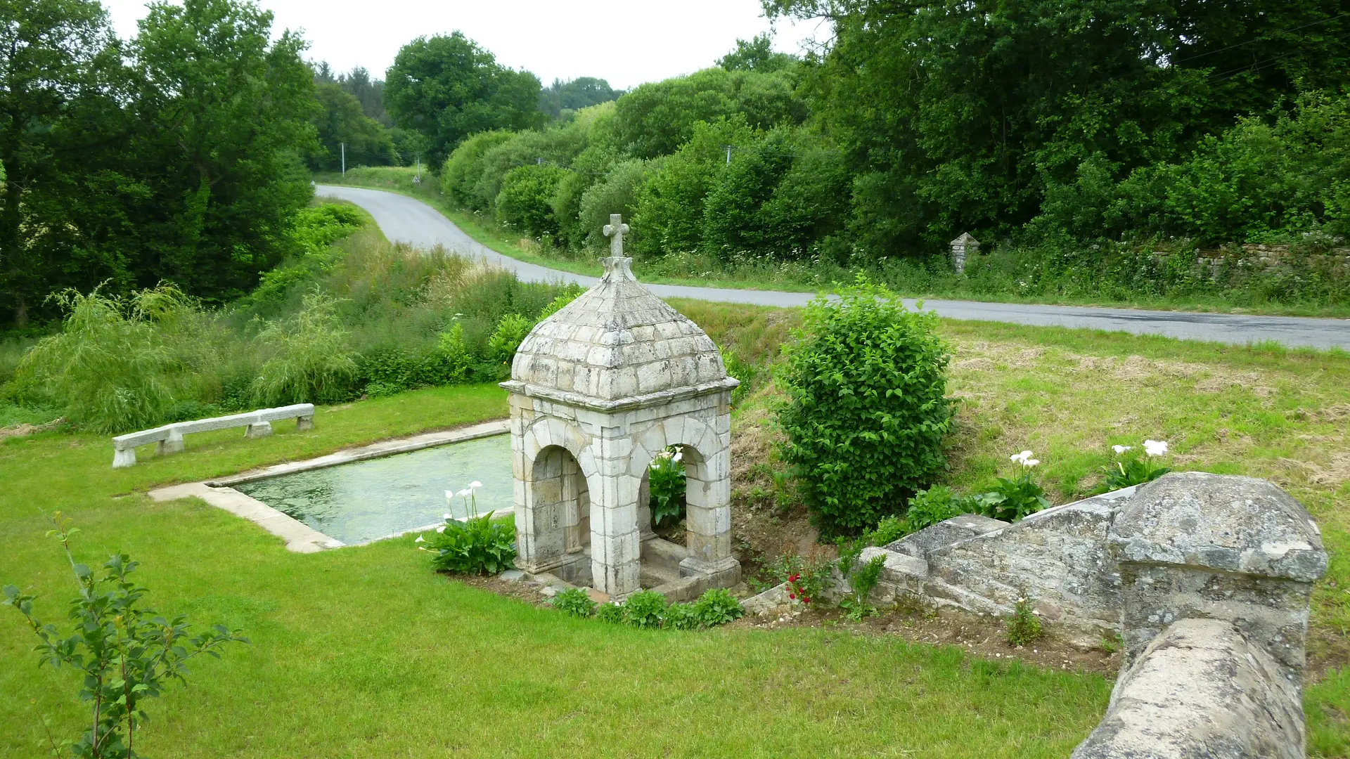 À quelques centaines de mètres de là, à l’est du village, on trouve la Fontaine de Saint-Mélaine. En contrebas de la route, près de deux menhirs, elle est surmontée d’une croix et possède un bassin qui servait autrefois aux lessives.