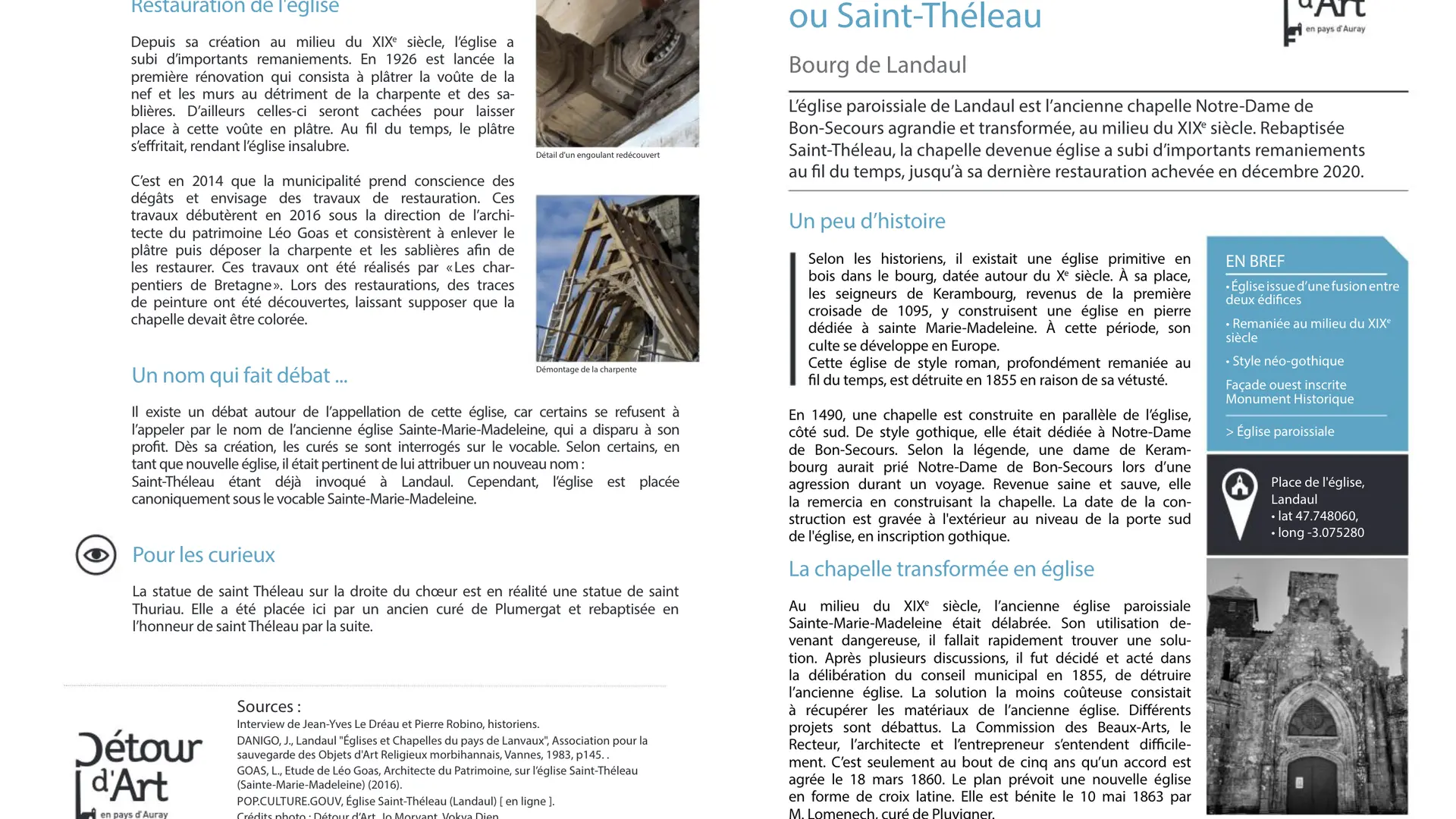 Située au cœur du bourg de Landaul, et datée du XVe siècle, l’église paroissiale Sainte-Marie-Madeleine ou Saint-Théleau est le résultat d’une fusion entre deux édifices religieux au cours du XIXe siècle que sont l’ancienne église Sainte-Marie-Madeleine et la chapelle Notre-Dame-de-Bon-Secours.