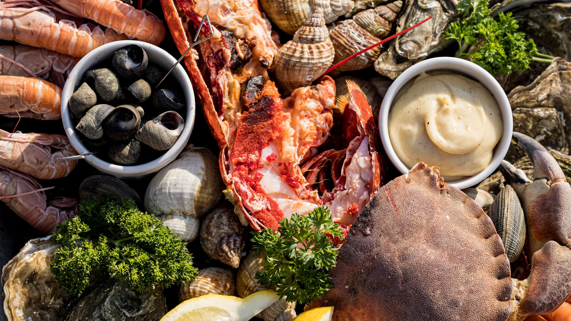 Huîtres, langoustines, crevettes, homards, tourteaux, bulots, bigorneaux, palourdes, etc. Dégustation avec une vue imprenable sur le Golfe du Morbihan.