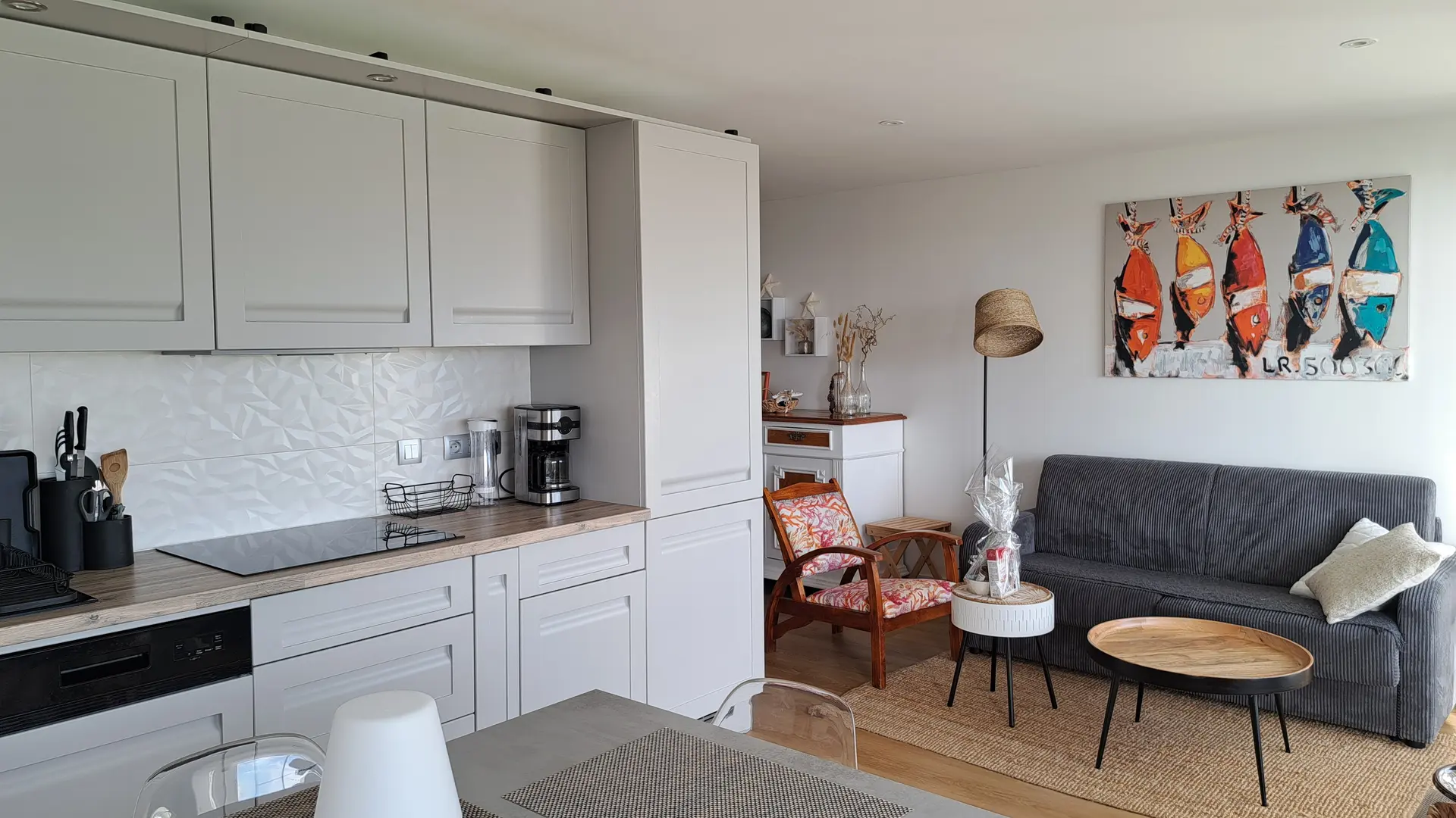 Une cuisine aménagée (lave-vaisselle, réfrigérateur-congélateur, plaques à induction, micro-ondes, four, bouilloire, cafetière, Nespresso, grille-pain, hotte aspirante)