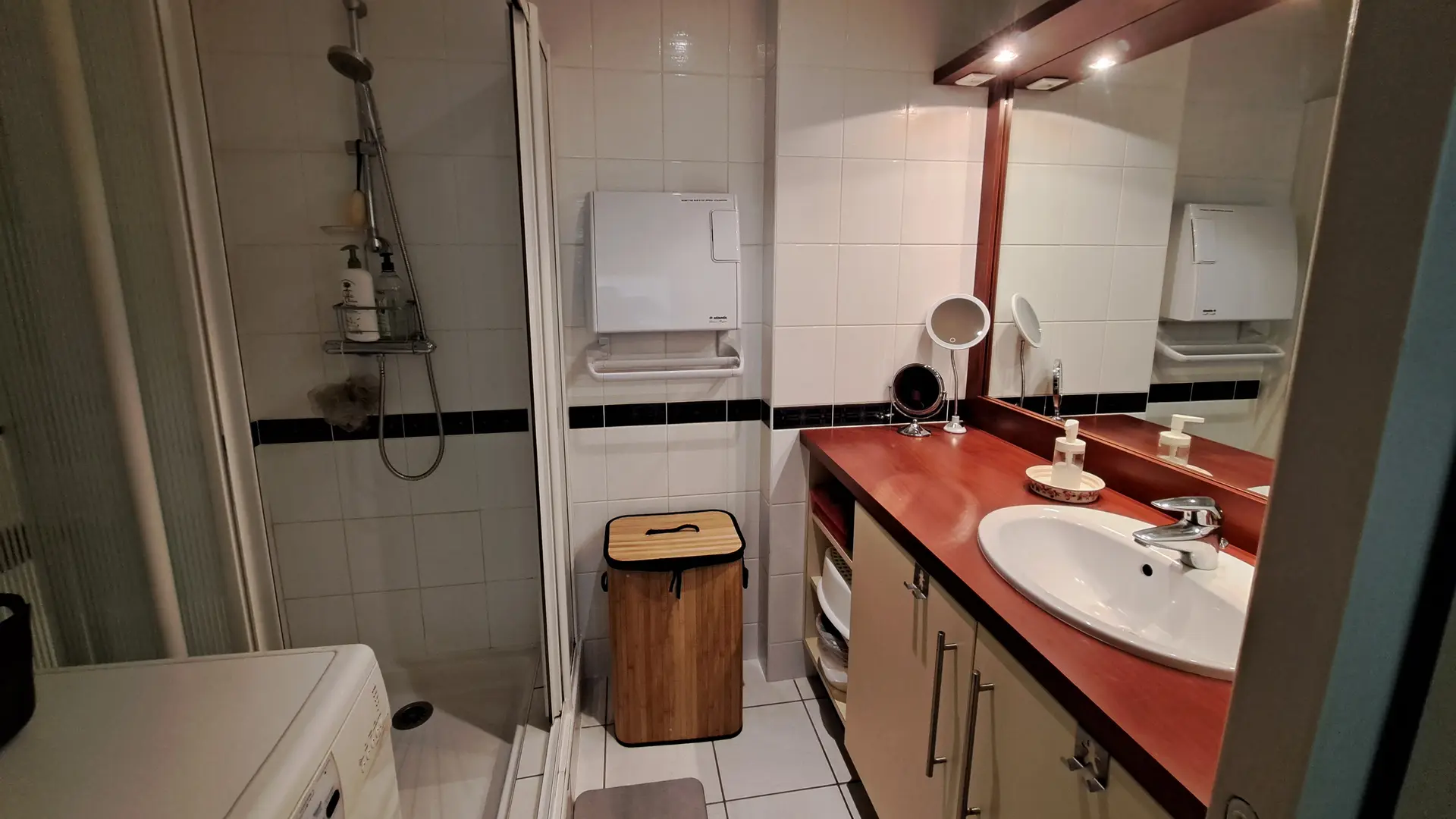 1 salle de bain avec douche, sèche-cheveux, lave-linge