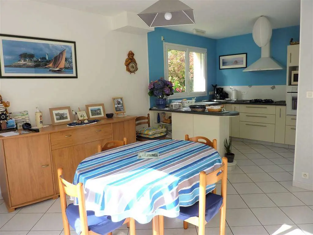 Maison plain pieds, secteur calme, 1 km de la plage, proche bourg, commerces et port, terrasse sud, terrain clos, barbecue. Séjour/salon/cuisine équipée. 2 chambres (lit 140 + 2 lits 90). Linge de toilette, draps, produits d’entretien fournis, SDE (douche) + SDB (baignoire). 2 télévisions, wifi. Accessible personne à mobilité réduite.