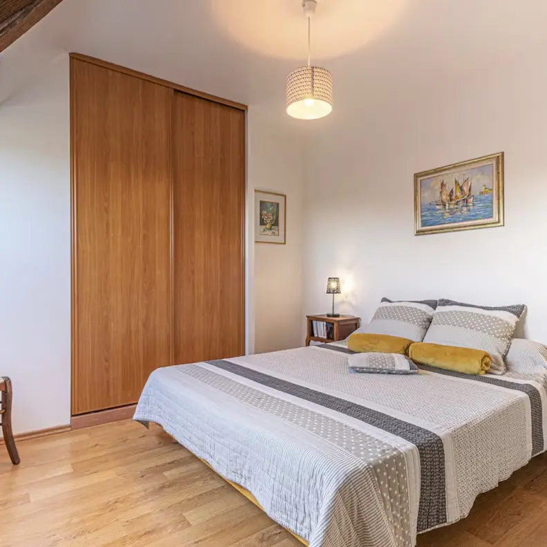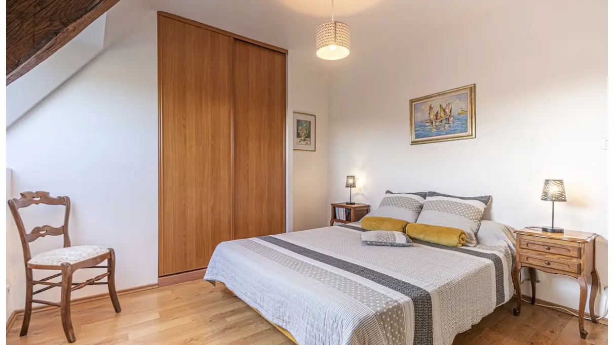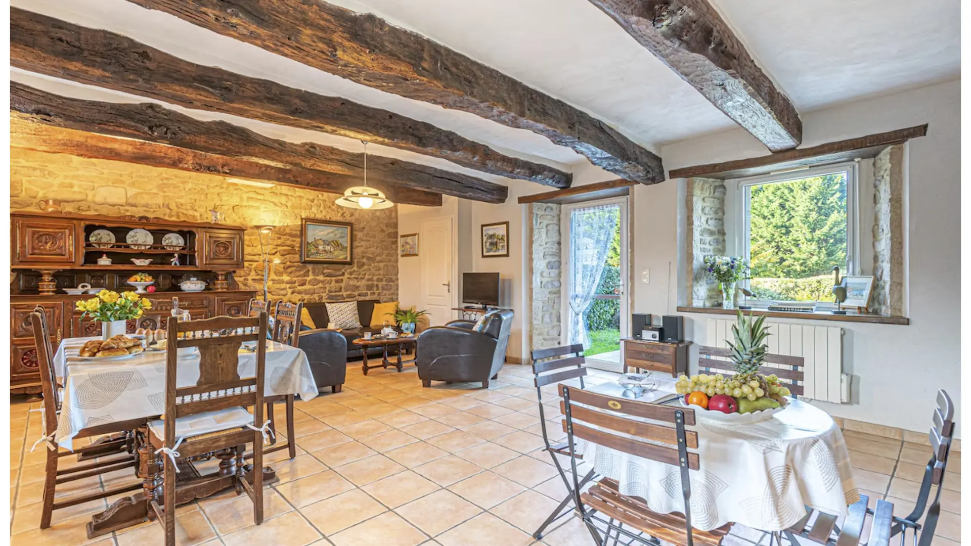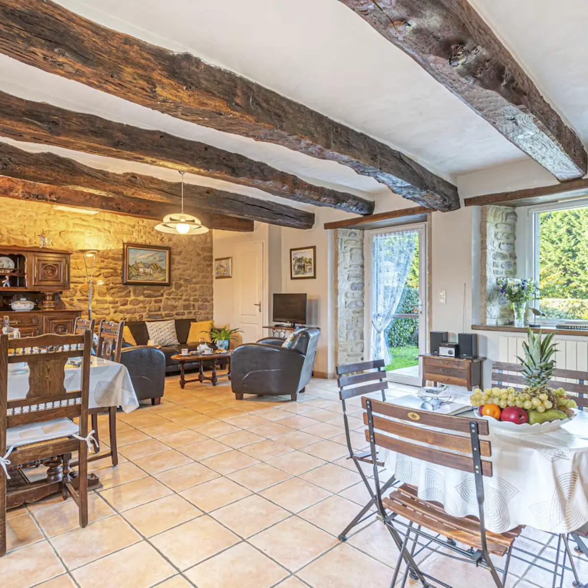 Le gîte dispose d’une grande pièce de vie et d’une cuisine entièrement équipée avec lave-vaisselle, four, micro-ondes, plaque de cuisson gaz, réfrigérateur-congélateur, cafetières, bouilloire et grille-pain. Il comprend deux chambres : la première avec un lit double 160x200 cm, la seconde avec un lit double 140x190 cm et un lit simple 90 cm, plus un lit bébé à disposition. Une salle d’eau et deux WC complètent l’aménagement. Le gîte offre également un accès internet haut débit via fibre et un espace adapté au télétravail.