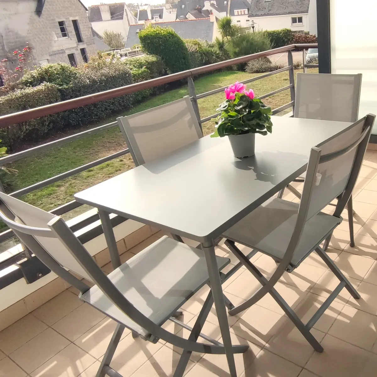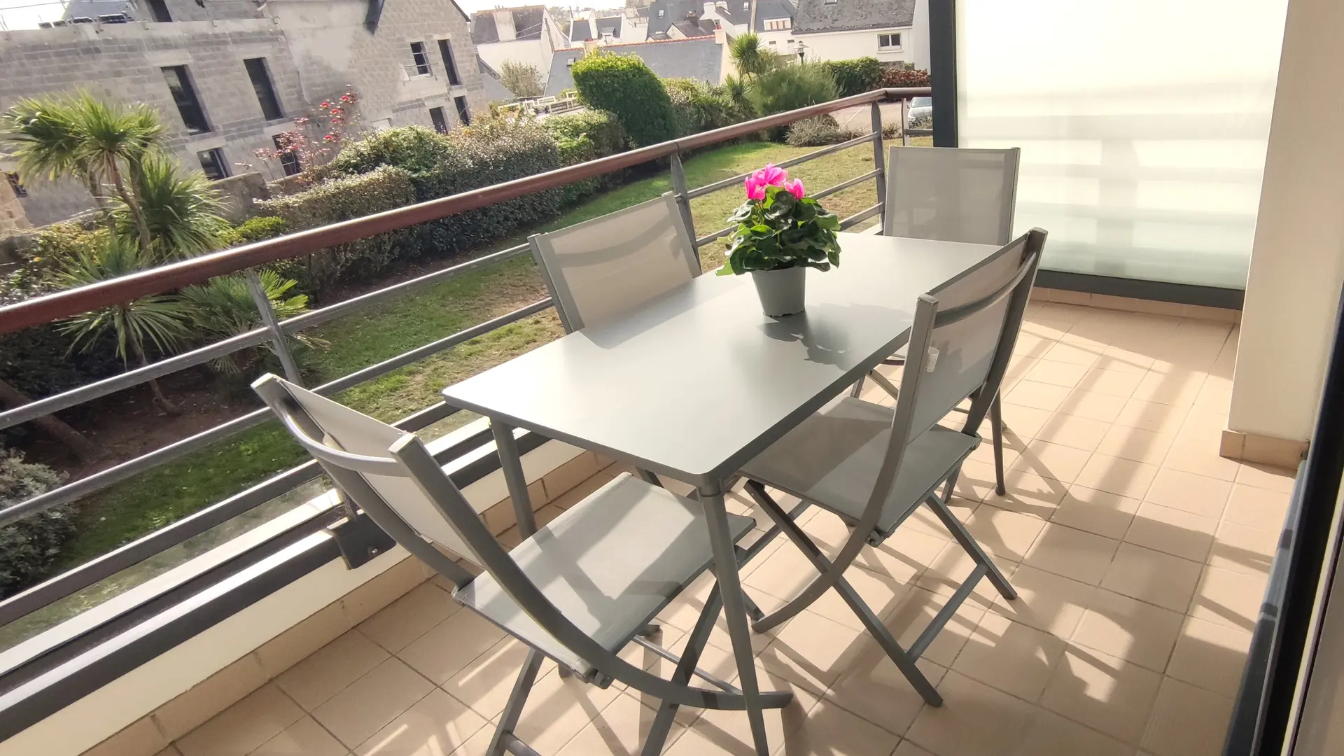 Plein sud sur grand balcon de 4mx2m équipé de store-bane et salon de jardin. Vue dégagée sur espaces verts. Parking privé sécurisé et local vélos.
