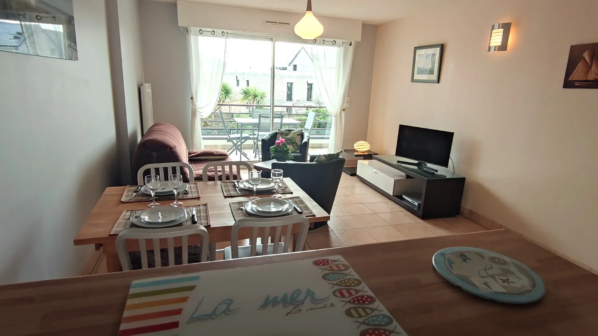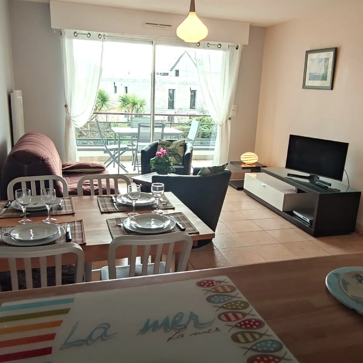 Entrée, séjour avec canapé BZ 2 personnes, TV, cuisine ouverte, lave-vaisselle, lave-linge, micro-ondes, grille-pain, presse-agrumes, fer à repasser...).
