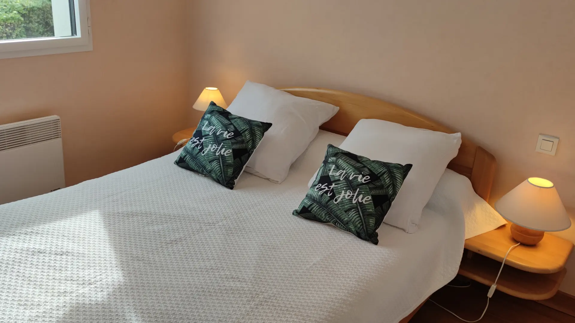 Chambre avec lit 2 personnes, salle d'eau avec douche, sèche-cheveux.